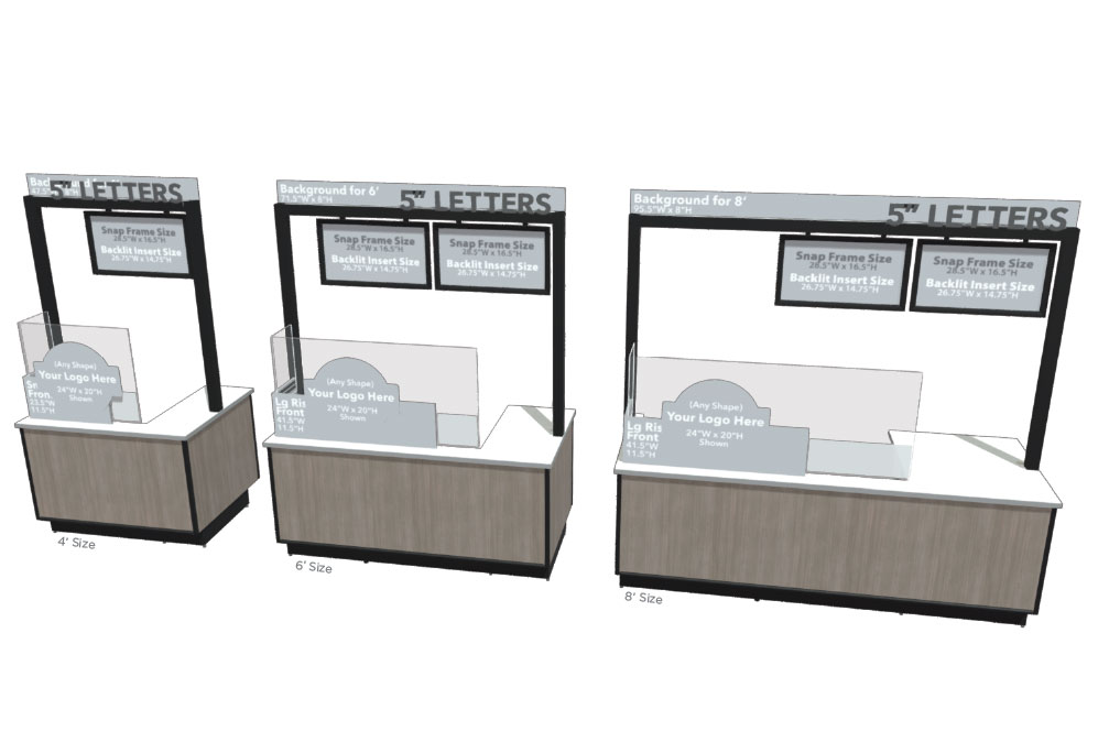 Attractive, contemporary and unique kiosks available in 4′, 6′, or 8′ designs. Choose a left cutout, right cutout or no cutout.